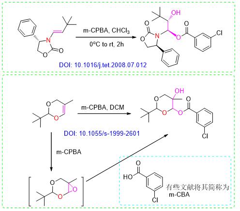 官能團的氧化 m-CPBA中弱的O-O鍵可以與多電子的底物反應,將氧原子轉移到底物分子上。它與酮和醛會發生氧的插入反應,經Baeyer-Villiger氧化機理生成酯。它與烯烴發生環氧化反應,立體專一性地生成順式產物。在合成對酸敏感的環氧化物時,必須使用NaHCO3或m-CPBA-KF試劑來控制反應體系的pH值。